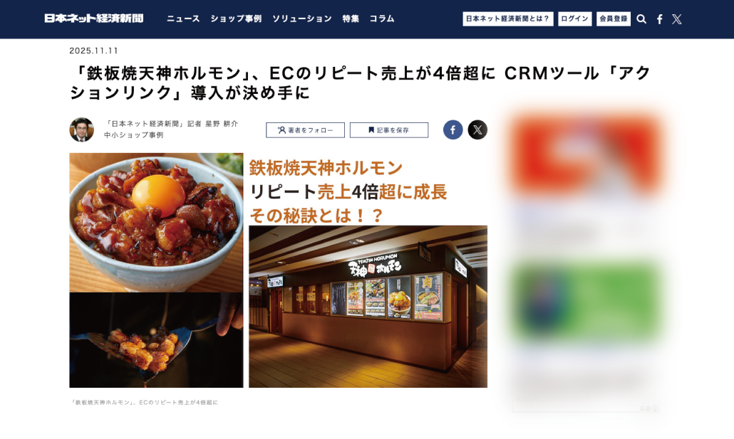 『日本ネット経済新聞』にて「天神ホルモン」様のアクションリンク活用事例を掲載いただきました!